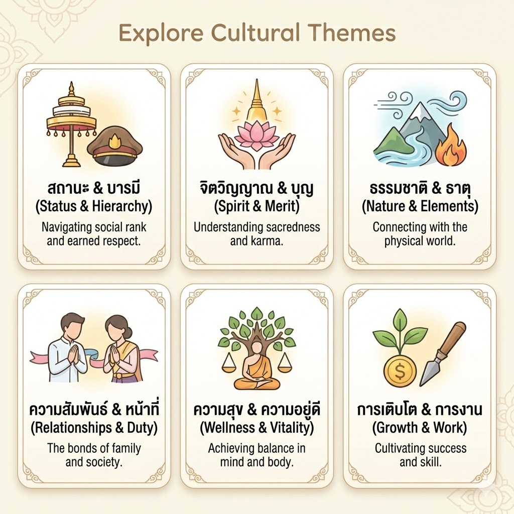 Thai uses complex metaphors and compound words. Visual maps and imagery break down these linguistic patterns into a clear, visible structure.