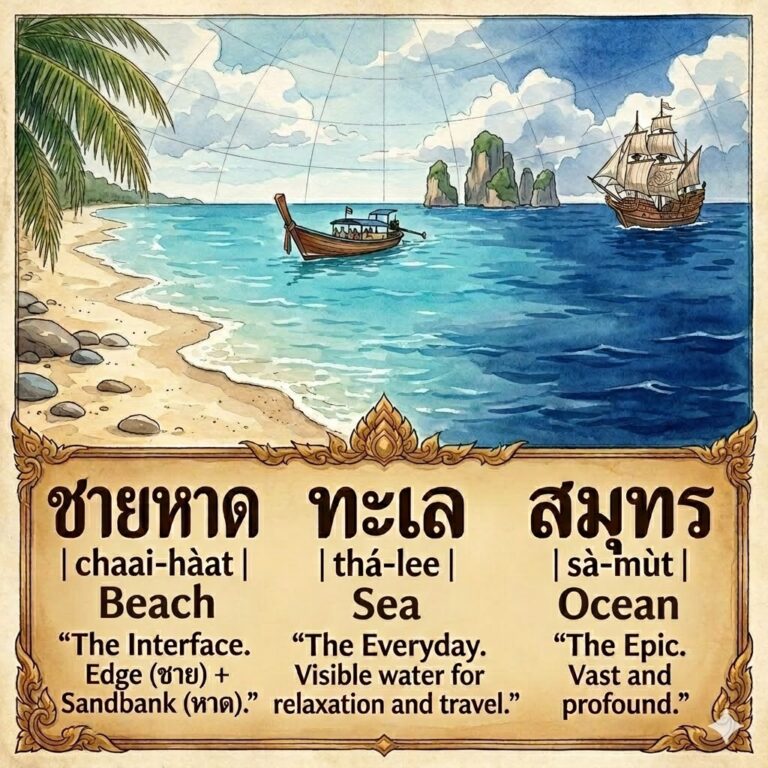 Learn when to use ทะเล (casual seaside), ชายหาด (the beach zone), and สมุทร (the vast ocean).