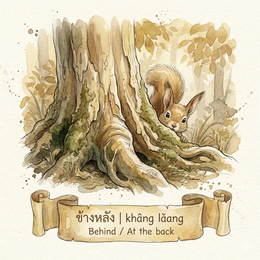 Beyond the literal Rear Side, the root [Lǎang] shifts between space and time in: 1) ลับหลัง 📣 (láp lǎang—Secret + Back): Doing something unseen or gossiping when unsupervised. 2) วันหลัง 📣 (wan lǎang—Day + Back): Refers to ‘Some other time’ or the future, viewing time as something coming after.