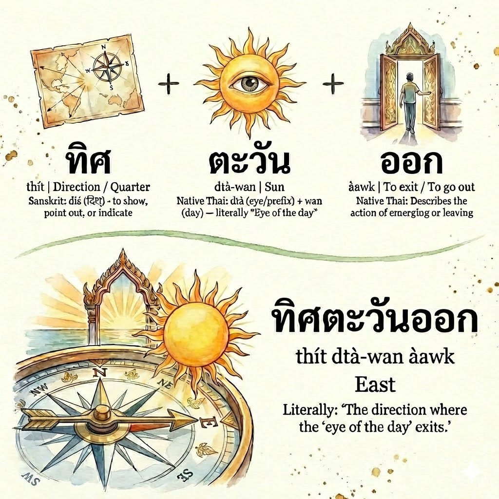 By combining ‘Direction’ with ‘Sun’ and ‘Exit,’ ทิศตะวันออก 📣 literally translates to ‘The direction where the sun comes out.’