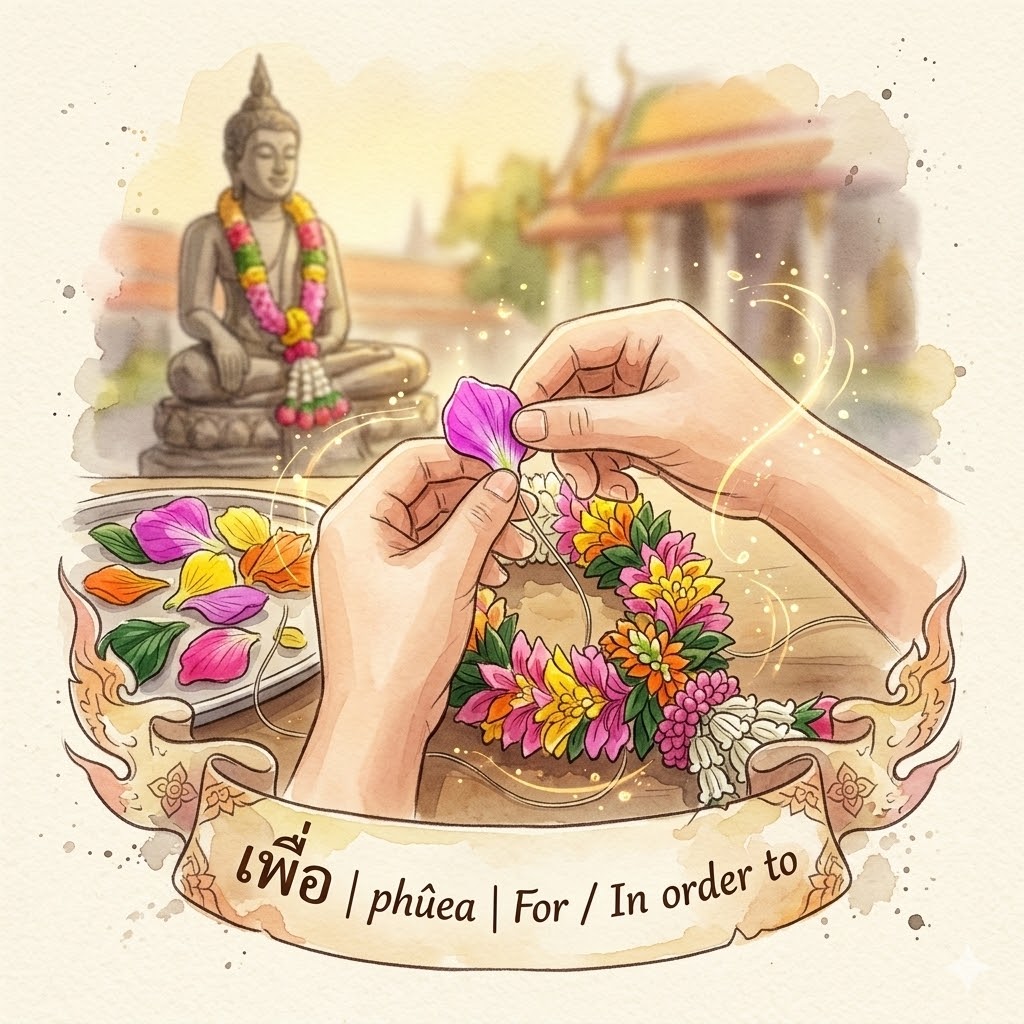 • เพื่อ 📣 (phûea): Is about Sacrifice/Investment. (e.g., “I work for the boss’s success.”) It’s a reason.