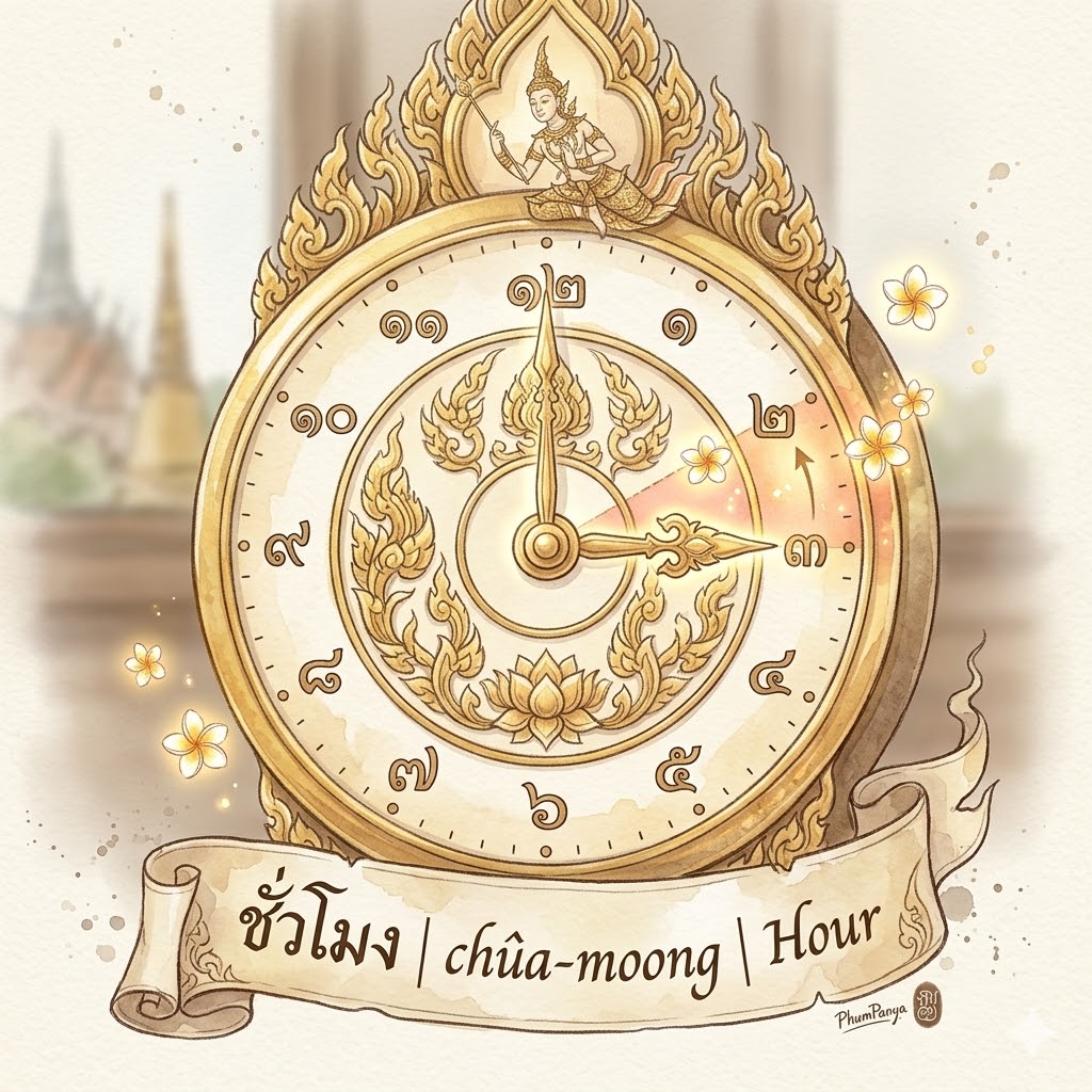 It combines ชั่ว 📣 (chûa — a span/period) and โมง 📣 (moong — the “moong” sound of a large gong). In ancient Thailand, day hours were marked by striking a large gong. One ชั่วโมง is the duration between those strikes.