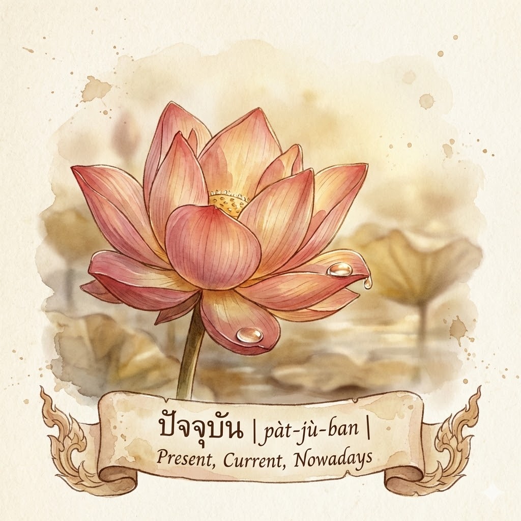 By combining ‘Facing/Towards’ with ‘Arisen,’ ปัจจุบัน 📣 (pàt-jù-ban) literally translates to ‘That which has arisen right in front of you.’ It creates an image of time not as a flowing river, but as events popping up specifically to face you in this exact moment.