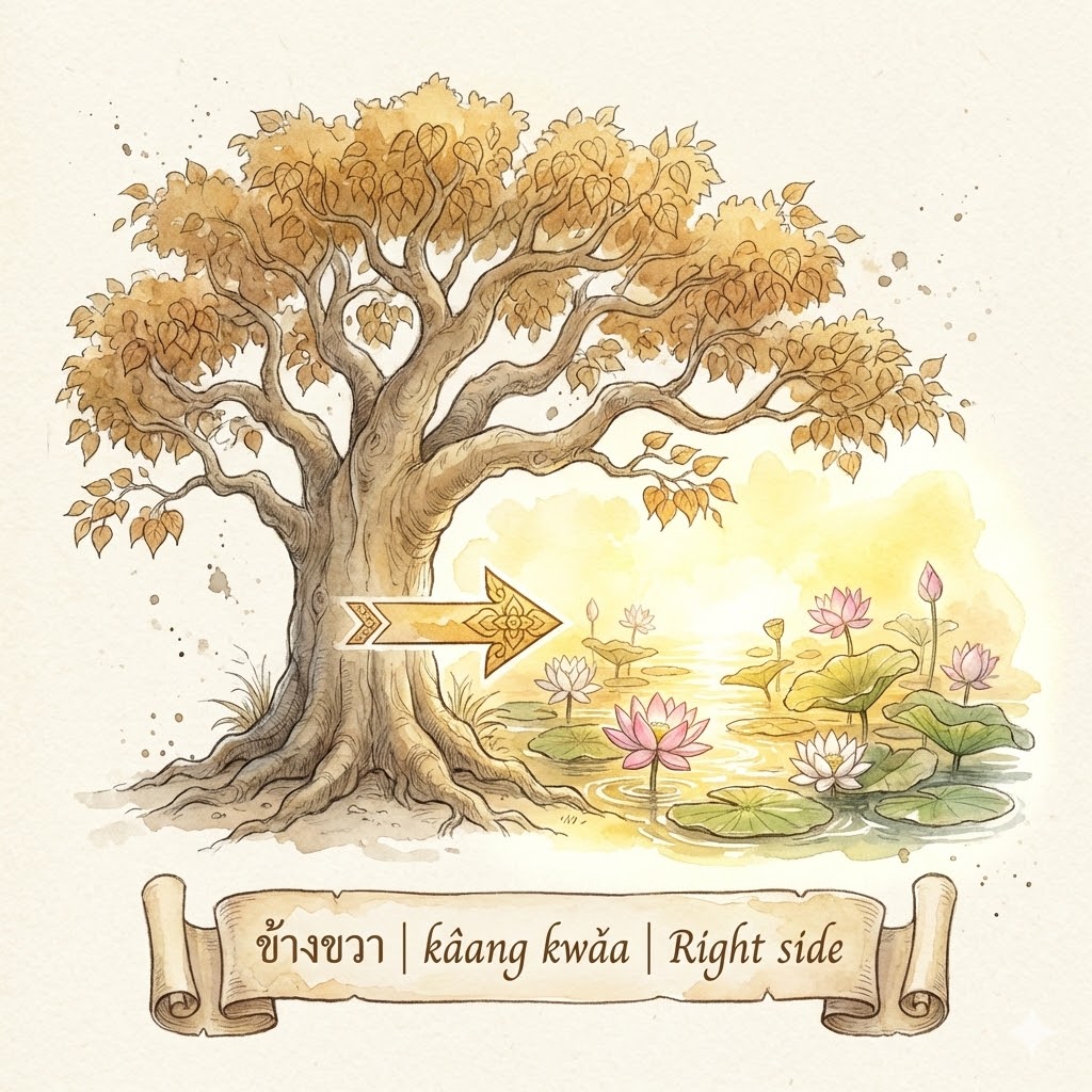 Beyond the literal Right Side, the root ขวา (kwǎa) is used in: 1) มือขวา 📣 (mue kwǎa—Right hand): A most trusted assistant or aide. 2) ปีกขวา 📣 (bpìik kwǎa—Right wing): Used in sports (football position) or politics (ideology).