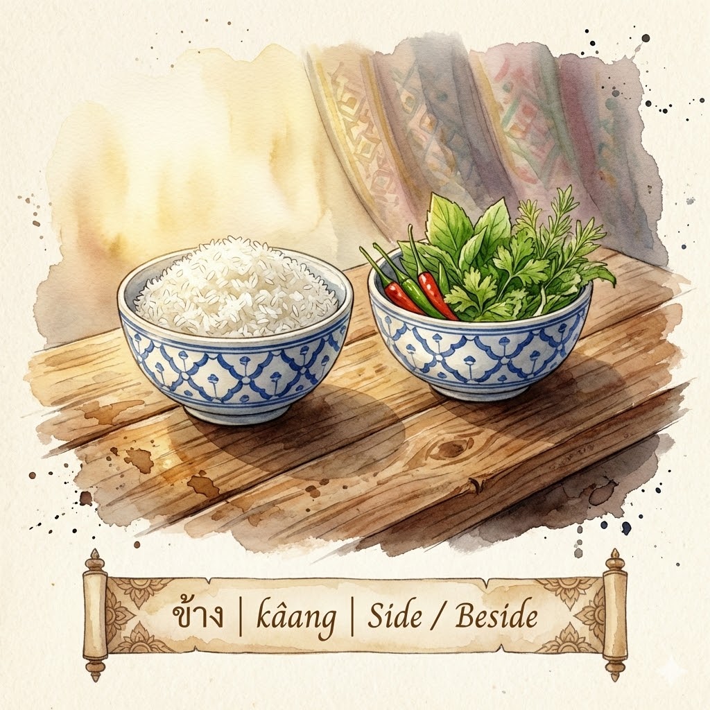 Beyond the literal Side, ข้าง is used in: 1) เข้าข้าง 📣 (kâo kâang—Enter Side): To be biased or support someone unfairly. 2) รักข้างเดียว 📣 (rák kâang diao—Love Side Single): Unrequited love.