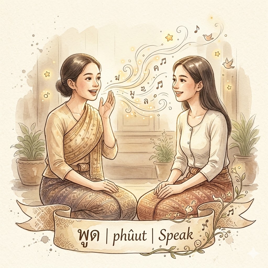 พูด 📣 (phûut): The action of speaking (the process).