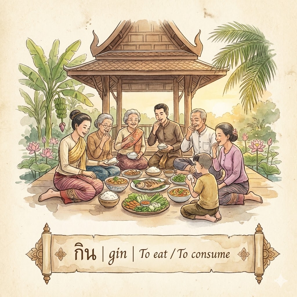 Beyond the literal Consuming, กิน is used in: 1) กินที่ (gin thîi—Eating Place): Taking up space unnecessarily. 2) กินแรง (gin raeng—Eating Strength): Slacking off while others work or mooching off someone’s effort.