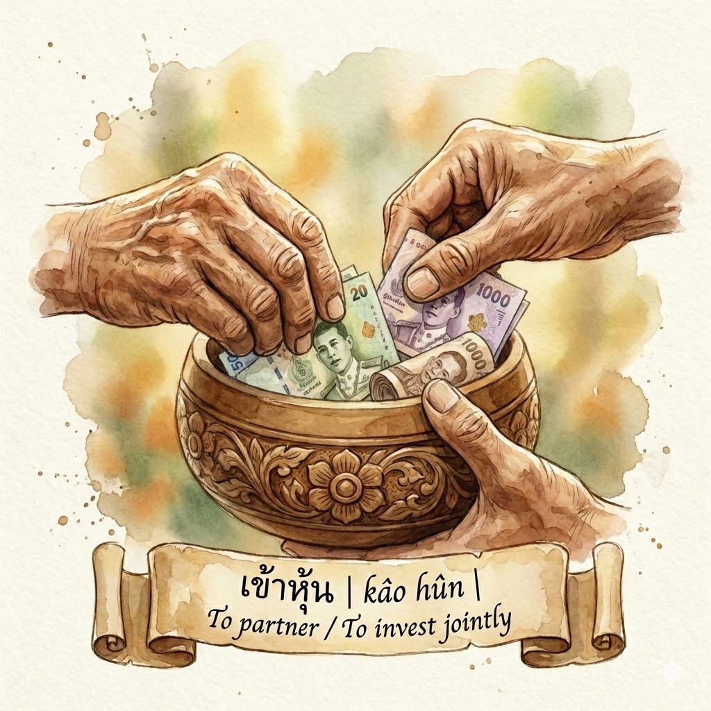 Beyond the literal Joining Shares, kâo hûn connects to: 1) หุ้นส่วน 📣 (hûn sùan—Share Part): A formal business partner. 2) หุ้นลม 📣 (hûn lom—Share Wind): Ownership given for free (usually for influence), not purchased with money.