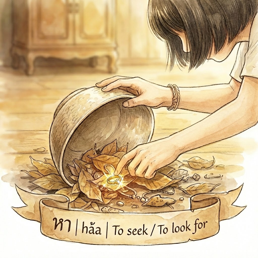 Beyond the literal Seeking, hǎa is used in: 1) หาเรื่อง 📣 (hǎa-rûeang—Seeking matter): Picking a fight or looking for trouble. 2) หากิน 📣 (hǎa-gin—Seeking eat): Making a living or earning money to survive.