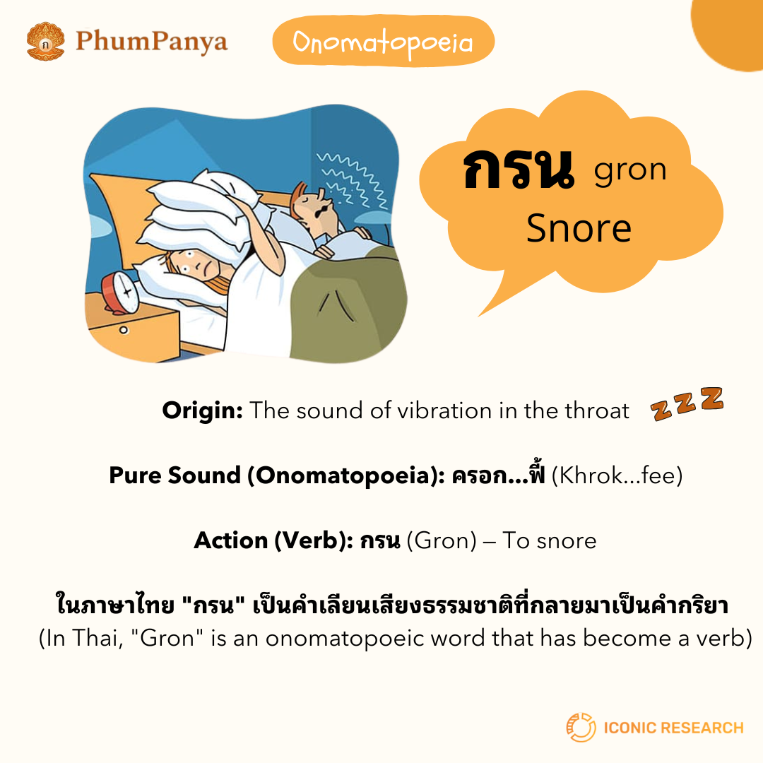 The Logic: In the Thai phonetic system, the -n ending acts as a “continuous” sound, representing the long, rhythmic nature of a snore. It is a word where the sound is the meaning.