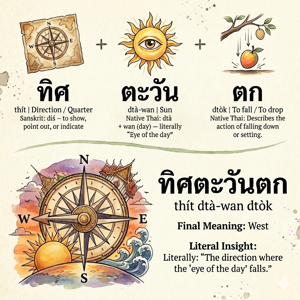 By combining ‘Direction’ with ‘Sun’ and ‘Fall,’ ทิศตะวันตก 📣 literally translates to ‘The direction where the sun falls’ (sets).