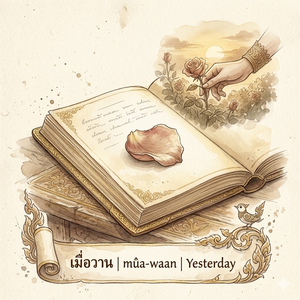 The word เมื่อวาน (mûea-waan) combines เมื่อ (mûea), a prefix meaning “at the time of,” with วาน (waan), an ancient Tai root specifically meaning “the previous day.”