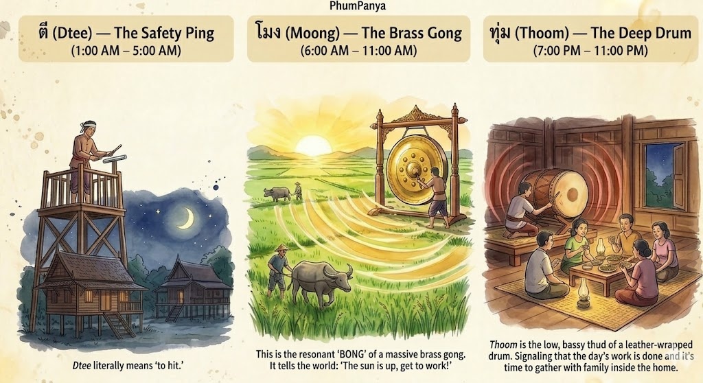 Long before smartphones, the village temple or the town watchmen would signal the hour using different instruments. The words Thais use today — Dtee, Moong, and Thoom are the echoes of those ancient tools.